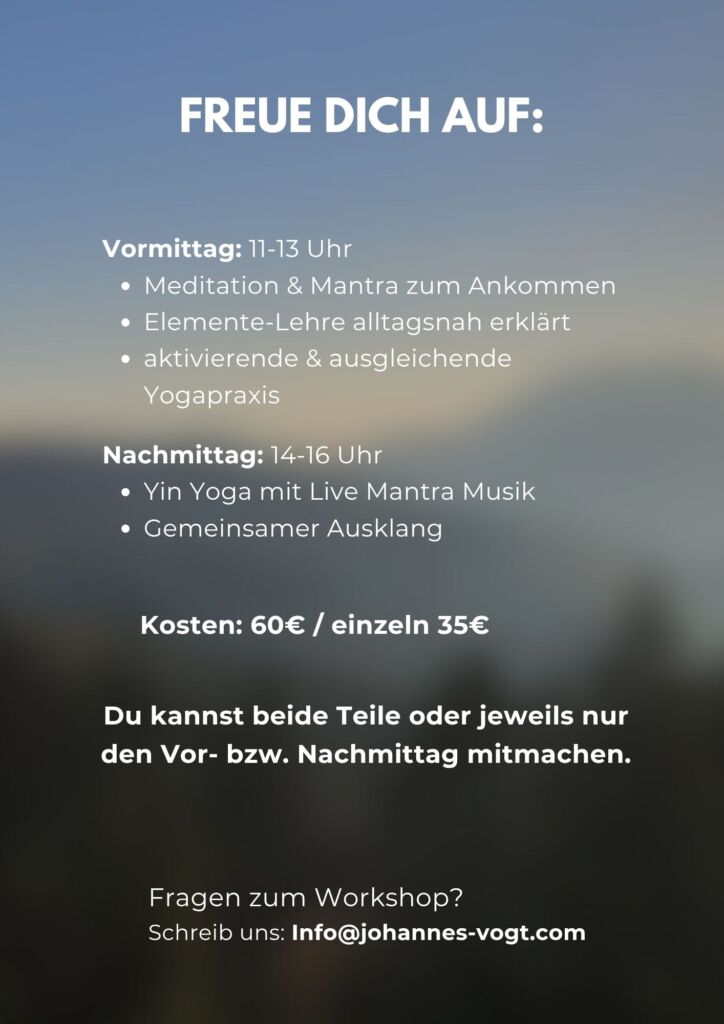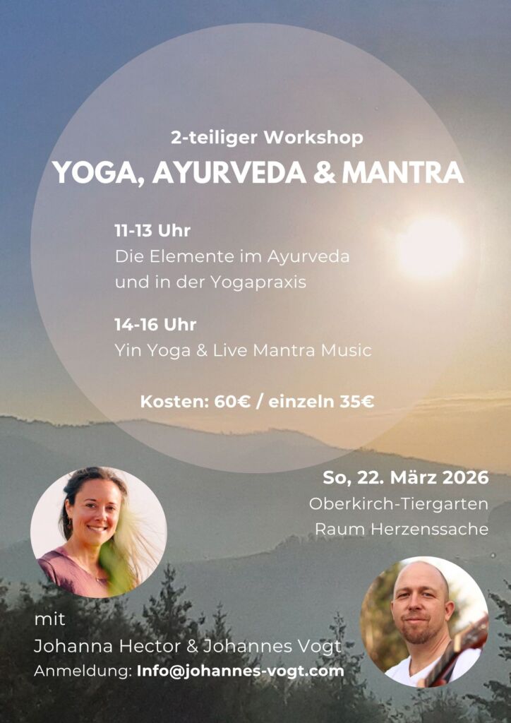Wie die Philosophie dieser ganzheitlichen Lehre in der Yogapraxis und im Singen von Mantras spürbar wird, erfährst du sowohl in der aktivierenden Yogapraxis am Vormittag und auch in der regenerierenden Yin-Yogastunde mit Live Mantra Musik am Nachmittag.